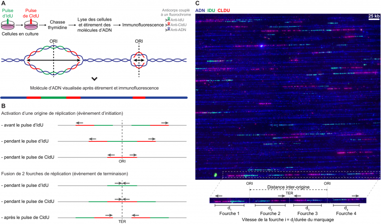 (A) Schéma du protocole expérimental de double marquage réplicatif de cellules en culture et exemple de signal théorique obtenu. L’ADN néosynthétisé est marqué successivement par un pulse d’IdU (en vert) puis un pulse de CldU (en rouge), dont l’incorporation est stoppée par l’ajout de thymidine (« chasse thymidine »). L’ADN extrait des cellules est ensuite étiré sur une lamelle de verre sur laquelle on procède à l’immunodétection de l’IdU et du CldU à l’aide d’anticorps spécifiques couplés à des fluorochromes. La molécule d’ADN complète (en bleu) est elle aussi révélée à l’aide d’un anticorps spécifique. La lamelle est ensuite observée au microscope. Les molécules d’ADN apparaissent sous la forme de lignes, y compris au niveau des régions répliquées. Les deux molécules filles présentes au sein de la bulle de réplication sont en effet juxtaposées lors de l’étirement.