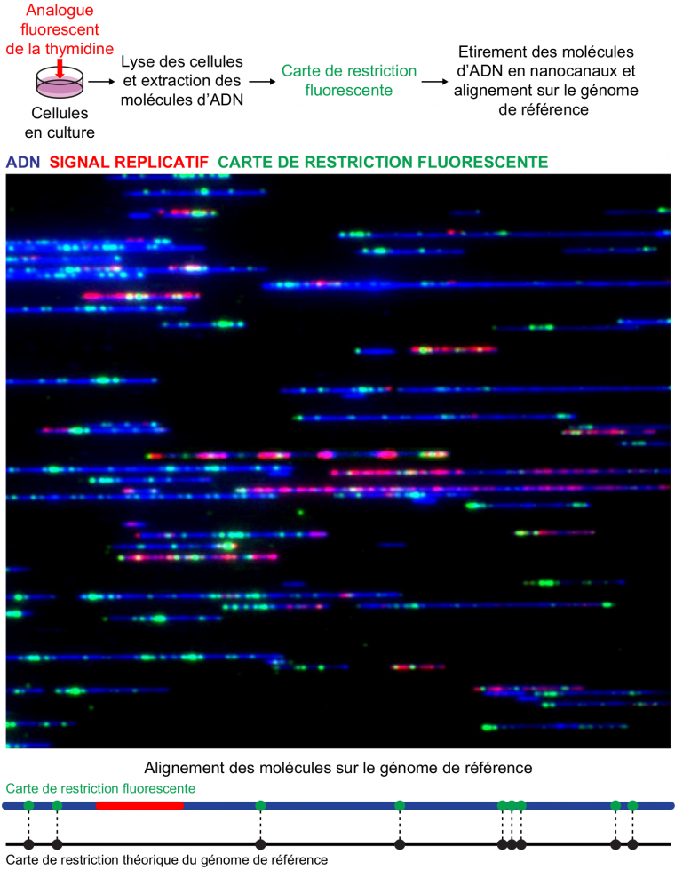 L’ADN néosynthétisé est marqué par un analogue de la thymidine couplé à un fluorochrome (AF647-dUTP, en rouge). Après extraction, l’ADN est digéré par une nickase, c’est-à-dire par une enzyme de restriction coupant un seul des deux brins. Puis, des nucléotides fluorescents sont incorporés au niveau des sites de coupure simple brin, créant une carte de restriction fluorescente, ou « code-barre » optique (en vert) propre à chaque molécule. Les fibres d’ADN sont ensuite conduites par électrophorèse dans des nanocanaux où elles sont étirées de façon rectiligne par confinement, imagées automatiquement puis alignées sur le génome de référence grâce au « code-barre » optique, l'alignement étant basé sur la distance séparant les différents points lumineux. L’ADN est marqué au YOYO-1, un agent intercalant fluorescent (en bleu). Les molécules visualisées ici correspondent à de l’ADN de phage lambda.