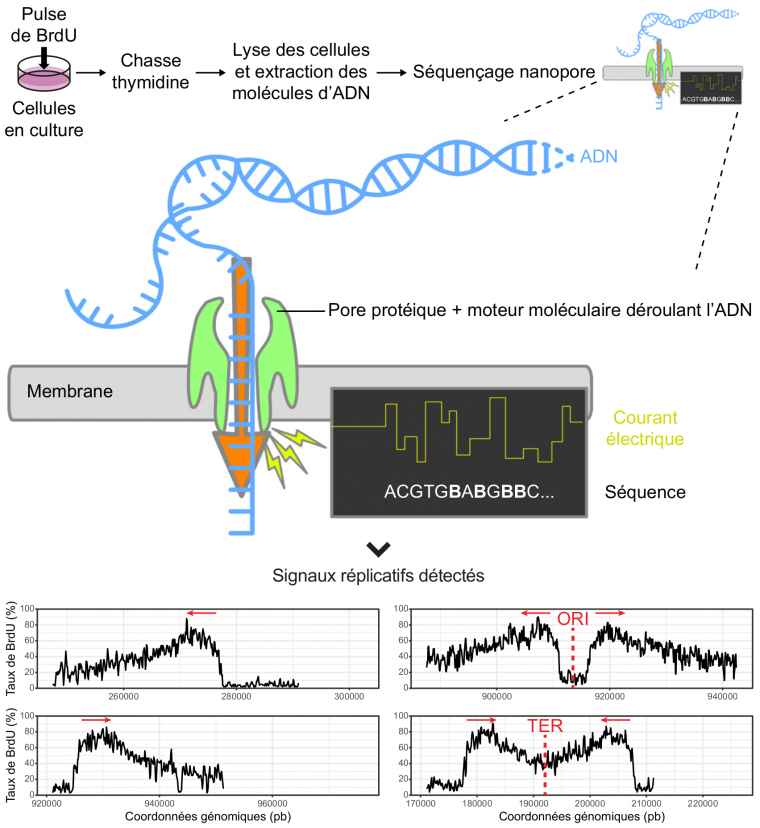 L’ADN néosynthétisé est marqué par un pulse de BrdU suivi d’une chasse thymidine. Lors du séquençage nanopore, les molécules sont déroulées en ADN simple brin et transloquées au travers de pores protéiques insérés dans une membrane soumise à un champ électrique. Les modifications du courant lors de la translocation sont enregistrées puis interprétées en séquence par un algorithme capable de détecter le BrdU (noté B) en plus des quatre nucléotides canoniques (A, T, C, G). Le taux de BrdU incorporé dans l’ADN est alors calculé tout au long des molécules séquencées. Lors de l’ajout de BrdU dans la culture, ce taux augmente rapidement, ce qui se traduit par une pente très forte marquant le début du pulse ; l’ajout de thymidine lors de la chasse dilue le BrdU et diminue son incorporation de façon plus progressive. L’asymétrie des pentes permet ainsi d’orienter les fourches de réplication et d’identifier les évènements d’initiation et de terminaison. On peut remarquer que la mesure du taux de BrdU est parasitée par des fluctuations de faible amplitude liées au processus de détection ; on parle de signal bruité. Les signaux réplicatifs présentés ont été détectés sur des molécules d’ADN extraites de la levure de boulanger, Saccharomyces cerevisiae. Les coordonnées génomiques sont indiquées sur l’axe des abscisses. ORI, origine de réplication ; TER, terminaison ; pb, paire de bases ; les flèches rouges indiquent le sens de progression des fourches.