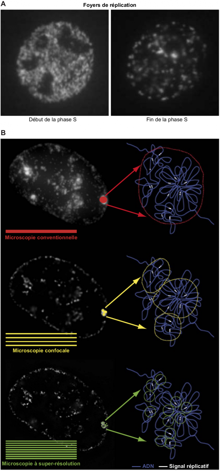 (B) Visualisation des sites de réplication dans le noyau de cellules de Mammifères à différents niveaux de résolution. L’amélioration de la résolution en microscopie a révélé que les foyers observés en microscopie conventionnelle peuvent être décomposés en sites de réplication de plus petite taille par microscopie confocale et microscopie à super-résolution, cette dernière permettant de visualiser des signaux correspondant à une fourche de réplication unique.