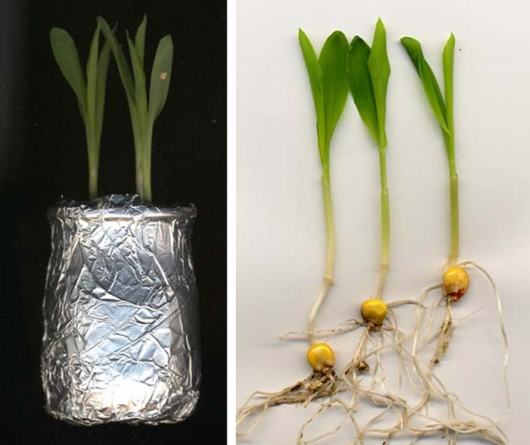 Quelle peut être la signification biologique de la croissance exacerbée observée à l’obscurité ? Réalisons une expérience très simple : dans un pot recouvert de papier aluminium, plaçons des grains de maïs à différentes profondeurs. Lorsque les jeunes feuilles sortent à la surface, déterrons les germinations.