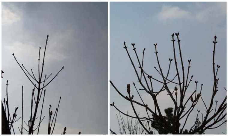 A gauche: une plante à croissance monopodiale observée en hiver, le cas typique de l’acrotonie.