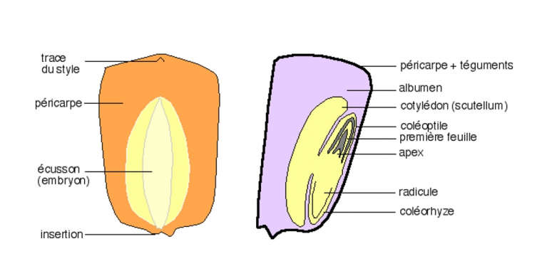 Le schéma de gauche présente l'aspect externe du grain du maïs et celui de droite une coupe sagittale longitudinale montrant l'organisation générale de ce caryopse