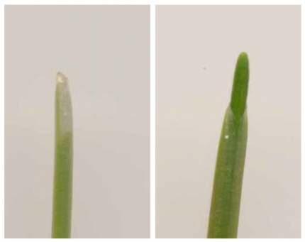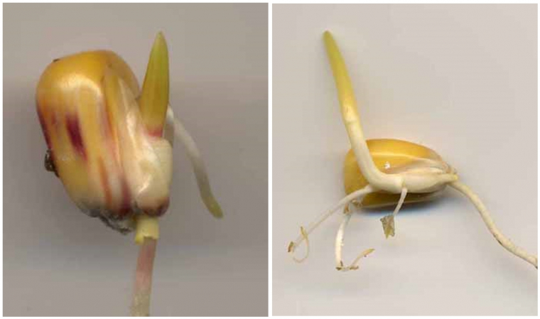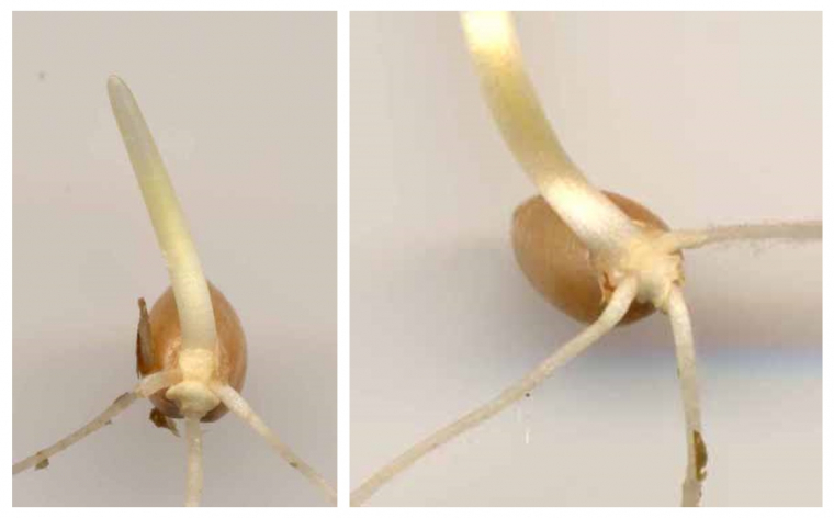 À droite, le mésocotyle, qui soulève le coléoptile (et donc l’apex et les jeunes feuilles contenues dans le coléoptile), est bien délimité.