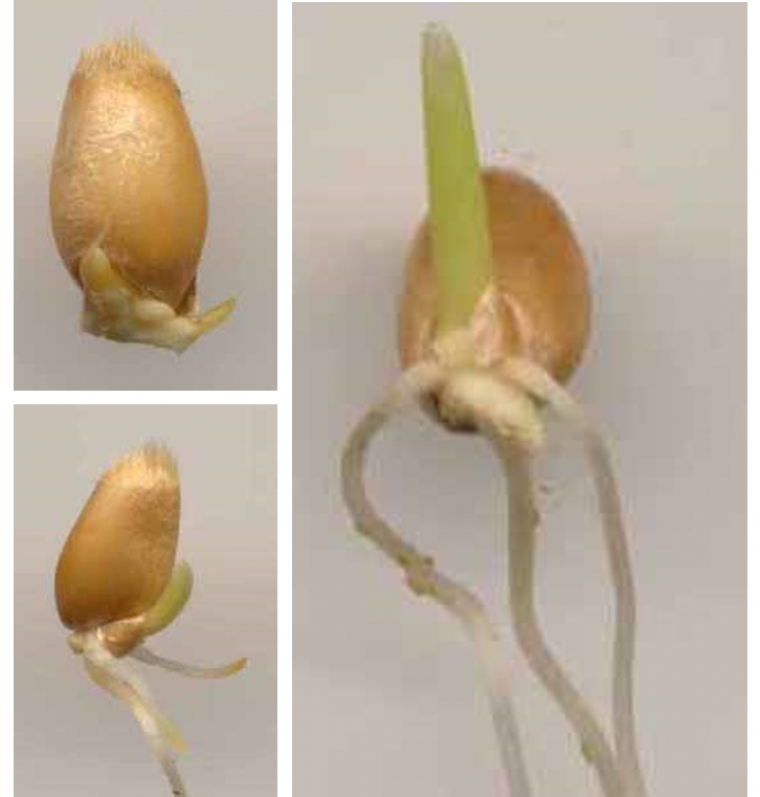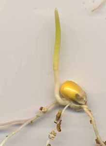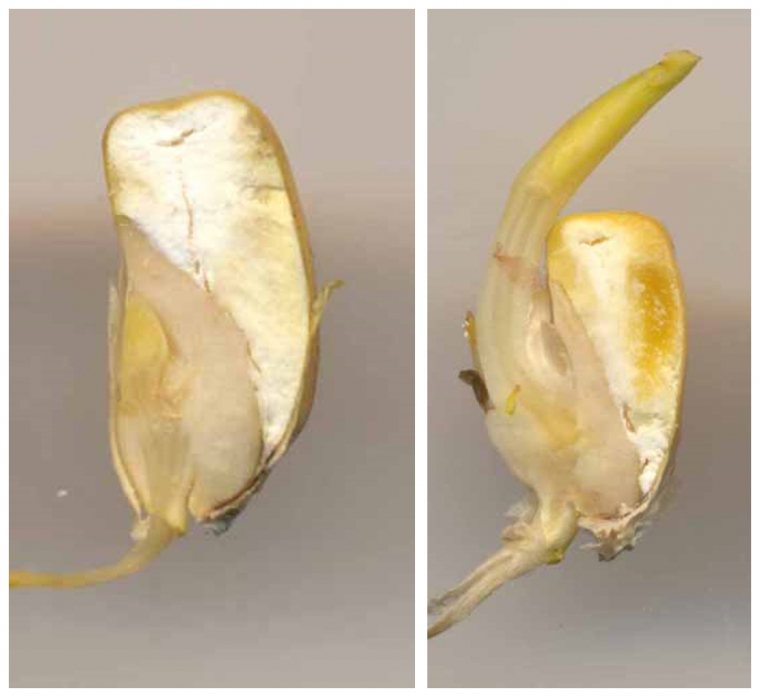 À gauche, on observe très nettement le coléorhize percé par la radicule.