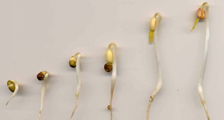 On constate que, quelle que soit la profondeur du semis, les parties aériennes sont toutes au même niveau. Ceci est dû à la croissance du mésocotyle, très rapide à l’obscurité (en profondeur) et qui se ralentit lorsque les parties aériennes arrivent en surface.