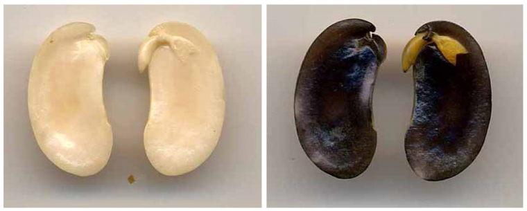 À droite, cette même structure a subi une coloration au lugol, mettant en évidence des réserves amylacées dans les cotylédons (mais pas dans la plantule).