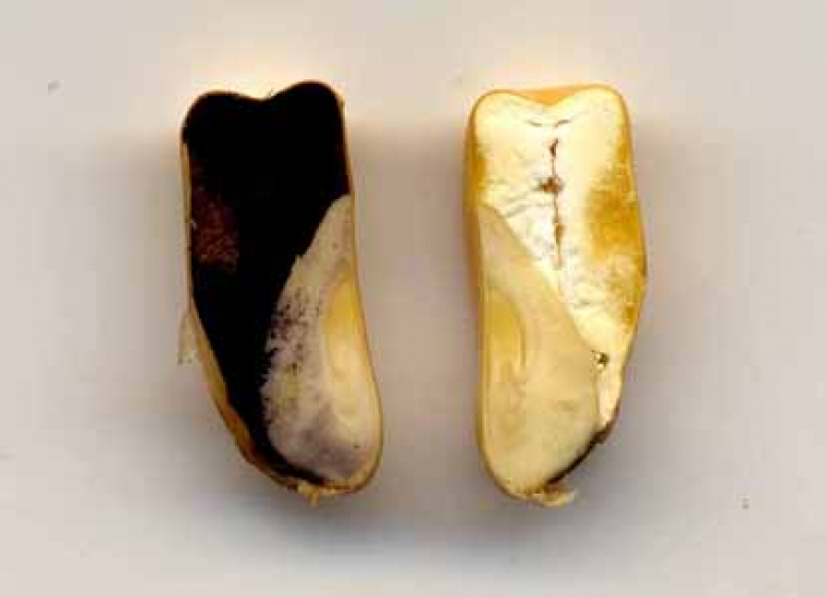 Sur ce caryopse de maïs, ouvert en deux longitudinalement, une moitié a été colorée au lugol