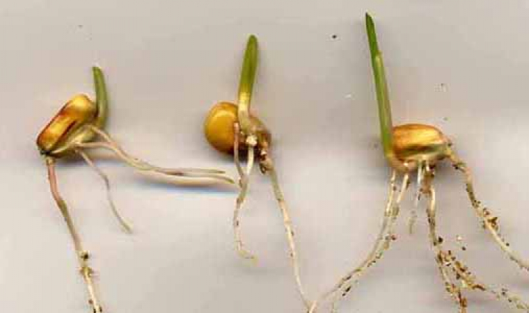 Sur les trois étapes de la germination d’un grain de blé, ci-dessus, on observe la sortie d’une première racine et d’un organe aérien (en vert), le coléoptile. Très rapidement le coléoptile grandit verticalement et de nouvelles racines apparaissent. Ces nouvelles racines sont ici au nombre de trois.
