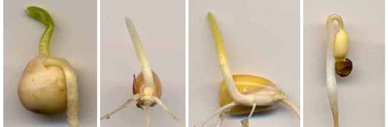 De gauche à droite: on peut observer une plantule de pois, une plantule de blé, une plantule de maïs et une de soja.