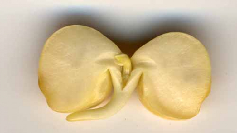 Sur cette graine de pois en germination, les cotylédons ont été écartés, laissant apparaître leur relation avec l'axe embryonnaire.