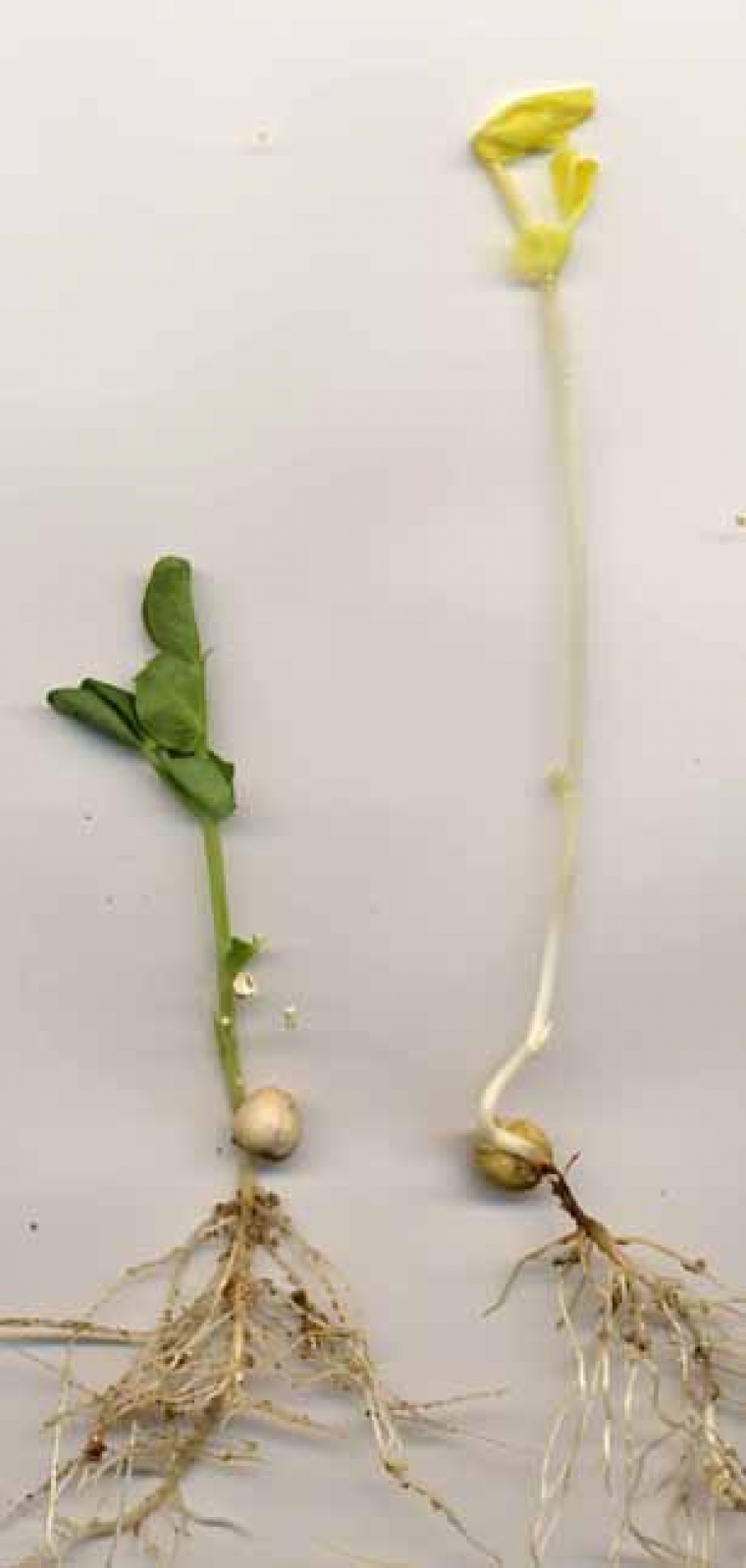 Le pois cultivé à l’obscurité présente les symptômes suivants, comme la plupart des dicotylédones :