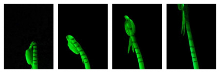 Ce type d’expérience peut être appliqué à différents organes comme des hypocotyles. Les images suivantes montrent quatre étapes de la croissance d’un hypocotyle de soja marqué. Une séquence vidéo accélérée montre la cinétique de la croissance.