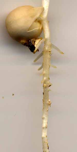L’observation du système racinaire d’une plantule plus âgée montre que la radicule est devenue une racine principale qui grandit verticalement vers le bas (gravitropisme positif, voir figure ci-contre).
