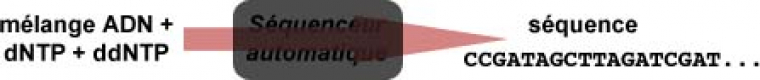 Les techniques de séquençage se basent sur ces connaissances. On procède de la façon suivante : une ADN polymérase synthétise le brin complémentaire de l’ADN à séquencer. Dans le milieu de réaction se trouvent des dNTP en grand nombre, et une faible proportion d’un ddNTP (à Adénine, ou Guanine, ou Thymine, ou Cytosine). A un moment totalement aléatoire, un ddNTP sera ajouté à la chaîne en cours de synthèse, par l’ADN polymérase. Cette synthèse s’arrêtera donc à cet endroit.