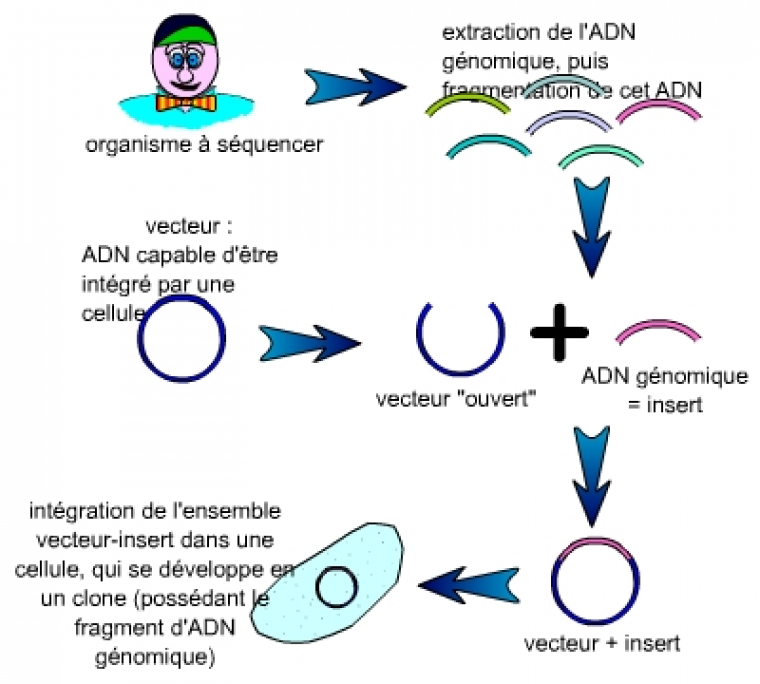 L’ADN génomique est fragmenté. Chaque fragment est inséré dans un vecteur, puis l’ensemble vecteur-insert est intégré dans une cellule (bactérie, levure…) qui, après étalement, se multiplie pour former une population de cellules toutes identiques (un clone), visible sous la forme d’une colonie.