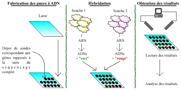 Les trois grandes étapes du processus sont schématisées : la fabrication des puces, l’hybridation, puis l’obtention des résultats.