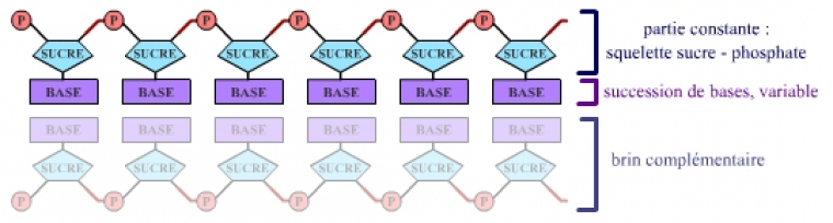 Les nucléotides, maillons élémentaires de l’ADN, peuvent être de 4 types différents dans cette molécule. Ils sont constitués d’une partie constante (squelette sucre-phosphate) et d’une partie variable, une base, du point de vue chimique. Les 4 bases présentes dans l’ADN sont notées A, T, G et C (Adénine, Thymine, Guanine et Cytosine).