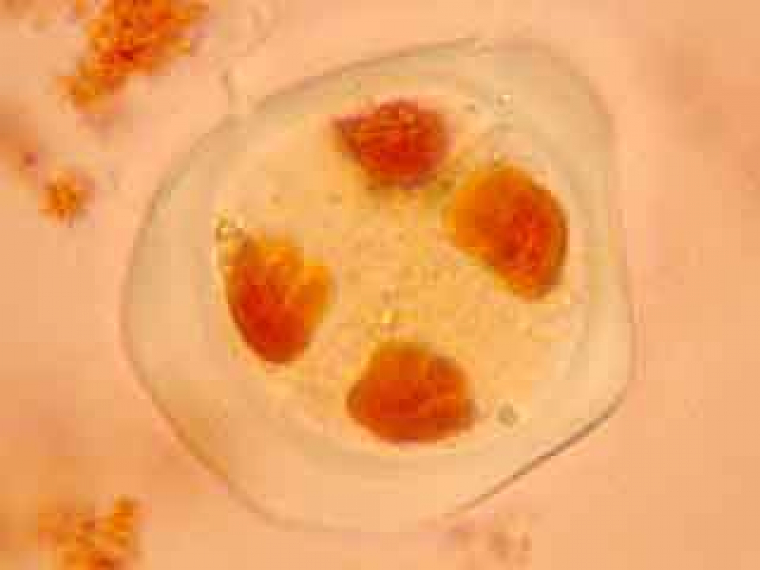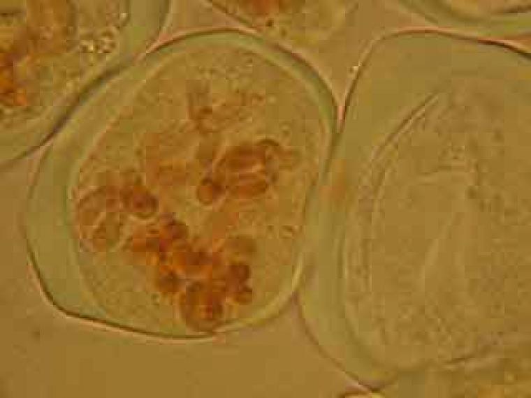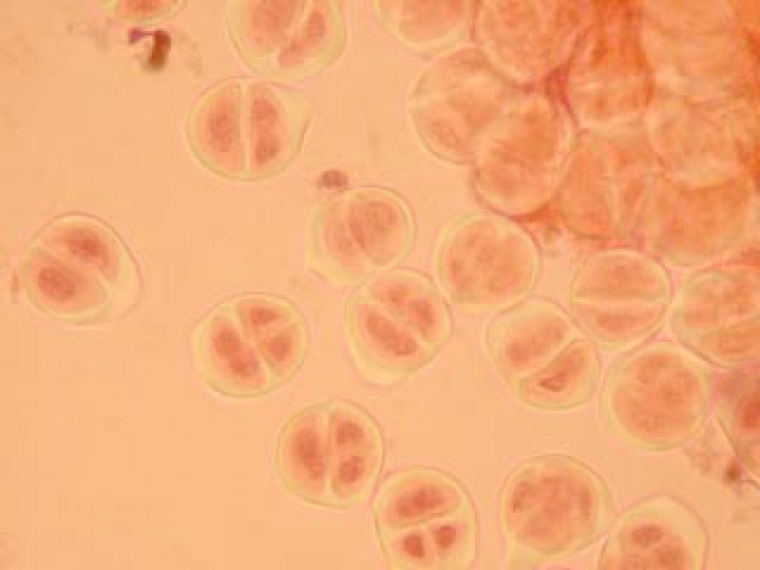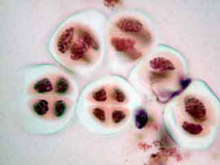 Selon l'orientation des cellules mères du pollen, on distingue nettement les quatre noyaux (cellules en bas à gauche) ou bien certains d'entre eux sont en partie masqués par les autres (cellules en haut à gauche).
