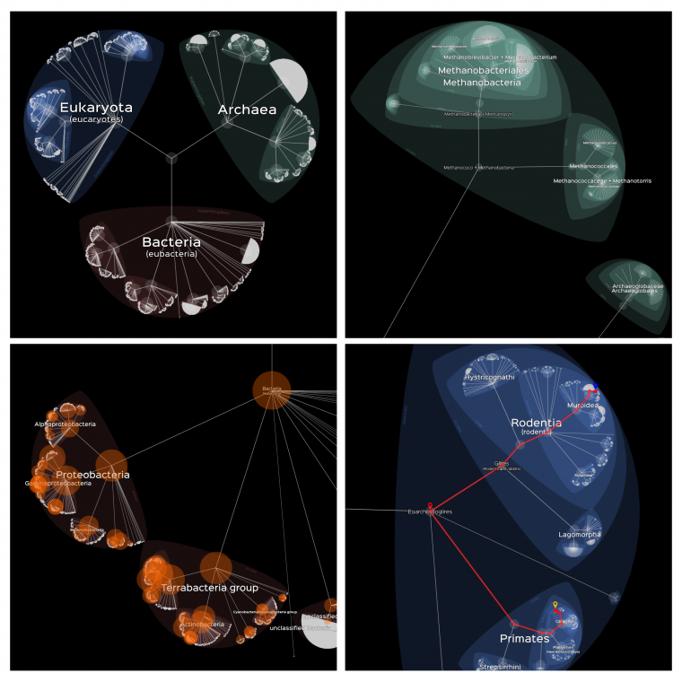 Deux caractéristiques majeures permettent à Lifemap de proposer, pour la première fois, une exploration aisée de l’intégralité de l’arbre de la vie. En premier lieu, Lifemap repose sur une nouvelle façon de visualiser des données hiérarchiques : chaque groupe d’espèces (ou clade) est représenté par un demi-cercle, contenu dans un demi-cercle plus grand représentant le clade de niveau hiérarchique supérieur (Figure 1).