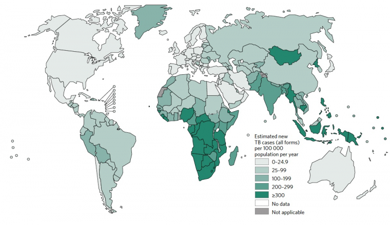 Mycobacterium tuberculosis, le bacille intracellulaire découvert par Robert Koch en 1882, est l’agent étiologique de la tuberculose humaine, une maladie contagieuse et chronique qui affecte essentiellement les poumons. Au niveau mondial, la tuberculose compte parmi les dix premières causes de mortalité. Elle constitue, avec le sida et le paludisme, les trois premières pathologies infectieuses qui menacent encore l’humanité. En effet, on estime que le tiers de la population mondiale porte cette bactérie de façon latente, d’où la déclaration en 1993 de la tuberculose comme une urgence mondiale par l’Organisation Mondiale de la Santé (OMS). Dans plus de 90 % des cas, l’immunité naturelle mise en place protège les individus de la conversion de l’infection latente vers une maladie active. Cependant, lors de l’affaiblissement du système immunitaire, lié à des facteurs tels que la malnutrition, l’âge, le diabète et surtout l’immunodéficience, génétique ou acquise, le risque d’évolution vers une tuberculose active s’accroît considérablement. À l’heure actuelle, 15 millions de personnes sont co-infectées par le VIH et M. tuberculosis dans le monde. La séro-conversion pour le VIH et l’immunodéficience subséquente augmentent de 30 fois le risque de développer une tuberculose active. L’ensemble de ces paramètres a conduit, en 2015, à la survenue de plus de 10 millions de nouveaux cas de tuberculose active et 1,8 millions de décès à travers le monde (1) (Figure 1).