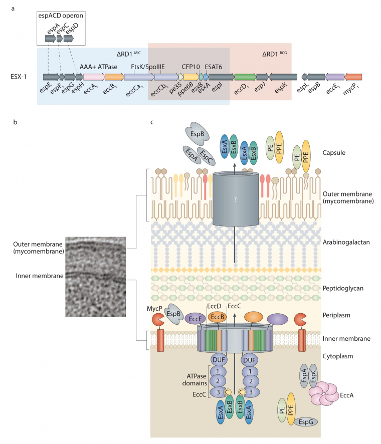 a. L’organisation de la région génomique codant pour les protéines du système de sécrétion ESX-1, de M. tuberculosis et de l’opéron « espACD » en amont de cette région. La région ESX-1 comprend les gènes codant pour l’antigène EsxA (aussi appelé ESAT-6) et sa chaperonne EsxB (également connue sous le nom de CFP-10), d’autres substrats nommés « Esp » (voir ci-dessous), mais aussi pour des protéines nommées « Ecc ». Ces dernières sont des composantes structurales de la machinerie de sécrétion ESX-1. Noter les segments « ΔRD1 » surlignés en rouge ou en bleu qui correspondent respectivement aux parties délétées chez M. bovis BCG ou chez une mycobactérie naturellement atténuée appelée Mycobacterium microti. b. Une image de microscopie électronique montrant les membranes interne et externe (dite aussi mycomembrane) de mycobactérie. La partie externe est composée d’une structure très dense et hydrophobe, riche en lipoprotéines, glycoprotéines et glycolipides, nécessitant divers appareils de sécrétion tels que ESX-1 en vue de l’export et la sécrétion de différents composés de mycobactéries, y compris les facteurs de virulence, vers le milieu extérieur. c. Schéma de l’appareil de sécrétion ESX (selon les données très récemment obtenues par analyses de particules(17) et des substrats sécrétés par la machinerie ESX-1. La plupart des composants identifiés jusqu’ici se localisent dans la membrane interne. Les composantes de la machinerie ESX-1 qui seraient localisées dans la mycomembrane restent encore à identifier. En plus des substrats EsxA et EsxB, on note la sécrétion des protéines : (i) « PE » et « PPE », ainsi appelées car elles comportent des motifs conservés Pro-Glu (PE) ou Pro-Pro-Glu (PPE) à leur extrémité N-terminale, et (ii) une famille dite « Esp » pour « Esx-1 secreted proteins ».