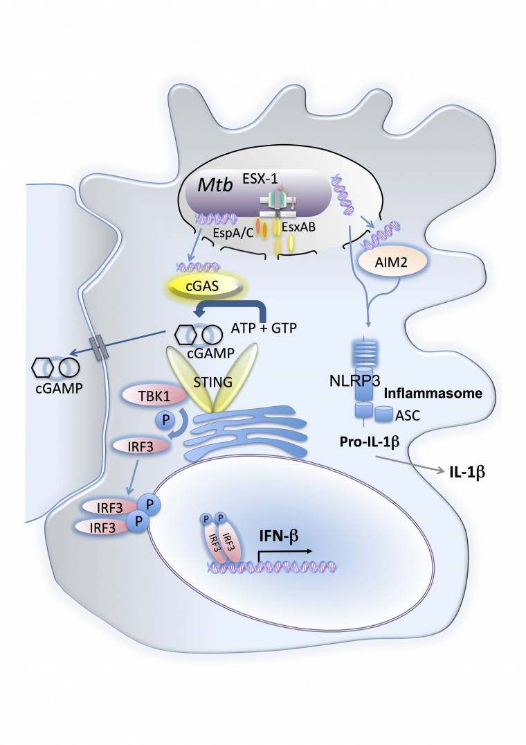 Un des principaux facteurs de virulence de M. tuberculosis (Mtb), EsxA, sécrété avec d’autres composés par le système ESX-1, induit des ruptures dans la membrane du phagosome à l’intérieur du macrophage infecté. Il est admis que cet événement déclenche la translocation cytosolique des composants de mycobactérie comme l’ADN double brin. (i) Ce dernier est détecté par le cGAS, qui synthétise le second messager cGAMP. Ce dernier active le STING associé au réticulum endoplasmique et la voie de signalisation qui induit la transcription des IFN de type I. cGAMP peut également se transmettre à des macrophages avoisinants non-infectés et les activer. (ii) L’ADN mycobactérien cytosolique peut également être détecté par AIM-2, un détecteur lié à l’inflammasome, ce qui renforce l’activation de cette voie et augmente la production et la sécrétion rapide de l'IL-1β active à partir du pro-IL-1β.