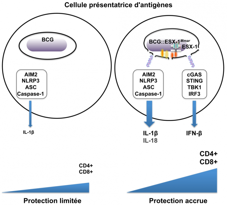 L’activation renforcée de l’immunité innée par l’appareil de sécrétion ESX-1 a pour conséquence l’amélioration des réponses T CD4+ et T CD8+ induites par BCG::ESX-1Mmar, ce qui est corrélé avec une protection améliorée lors d’une infection par M. tuberculosis virulent dans le modèle préclinique de souris.