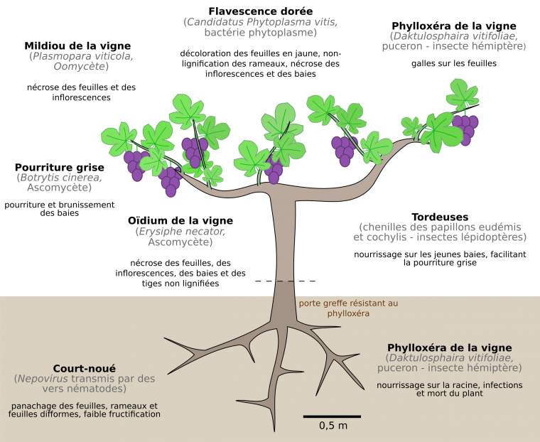 Le greffage est également une réponse à l’invasion d’un puceron d’origine américaine, le phylloxéra de la vigne (Daktulosphaira vitifoliae), qui ravagea les vignes européennes à la fin du XIXe. L’utilisation de porte-greffes d’espèces américaines résistantes (V. riparia, V. rupestris et V. berlandieri) donne des plants hybrides dont les rameaux sont des clones de cépages européens traditionnels. Cependant, d’autres maladies atteignent encore les vignes françaises (Figure 10) [4].