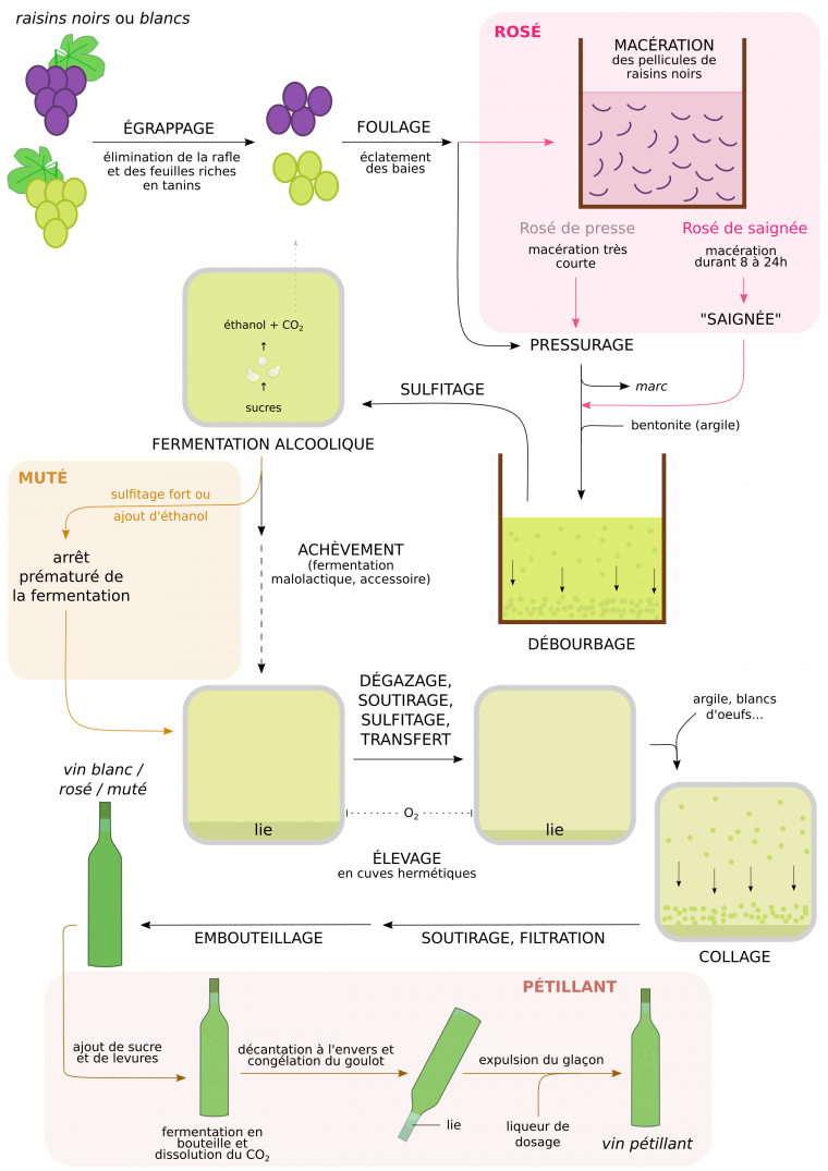 La saignée sépare le moût coloré des pellicules par simple écoulement. Les vins mutés peuvent être des vins rouges ou blancs, et sont souvent élevés en fûts de manière à développer leurs palettes aromatiques. La seconde fermentation des vins pétillants se déroule soit en cuves résistantes à la pression, soit en bouteille (schéma). Dans ce dernier cas, la liqueur de dosage (vin mélangé à du sucre) permet de compenser le volume perdu durant le débouchage, et est ajoutée rapidement avant le rebouchage. La concentration finale en sucres détermine l’appellation du vin : extra brut, brut, sec, demi-sec, doux (concentration en sucres croissante).