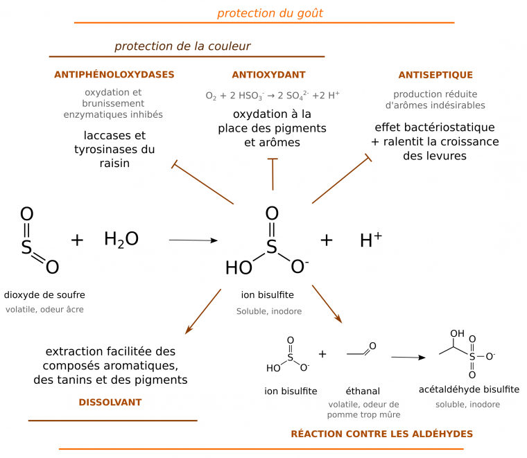 Quasiment indispensable en vinification, le dioxyde de soufre exerce un rôle antioxydant [4, 14] :