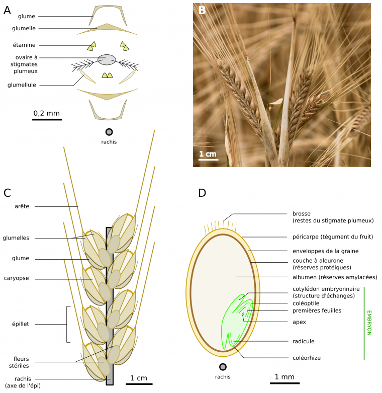 A : diagramme floral d’un épillet à une fleur ; B : photographie d’épis ; C : schéma d’un épi d’épillets ; D : schéma en coupe longitudinale d’un grain (= caryopse).