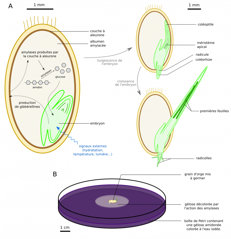 B : mise en évidence de la production d’amylases par le grain au cours de sa germination.
