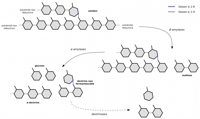 Les β-amylases hydrolysent l’amidon à partir de ses extrémités réductrices (activité exolytique) et produisent du maltose ; les α-amylases hydrolysent les liaisons α 1-4 au sein l’amidon (activité endolytique) et produisent des oligomères α 1-4, dont des dextrines non-fermentescibles qui ajoutent de la texture à la bière [9, 11].