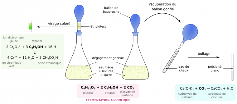 Des levures Saccharomyces cerevisiae sont mises en suspension dans de l’eau tiède et sucrée. Après quelques dizaines de minutes, on observe un virage coloré de l’éthylotest placé à la sortie de l’erlenmeyer. Par ailleurs, le gaz contenu dans le ballon trouble l’eau de chaux. La réalisation d’expériences témoins (sans sucre ou sans levures) permet de déduire que les levures consomment des sucres et produisent de l’éthanol et du dioxyde de carbone, avec pour équation-bilan : C6H12O6 → 2 C2H5OH + 2 CO2