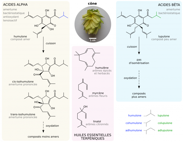 - Des acides alpha (isohumulones), qui confèrent l’amertume à la bière. Ils ont également des propriétés bactériostatiques sur les bactéries Gram +, antioxydantes, et favorisent la tenue de la mousse (propriétés tensioactives). Leur isomérisation durant la cuisson augmente l’amertume de la bière, mais leur oxydation au cours de la vie de la bière la diminue.