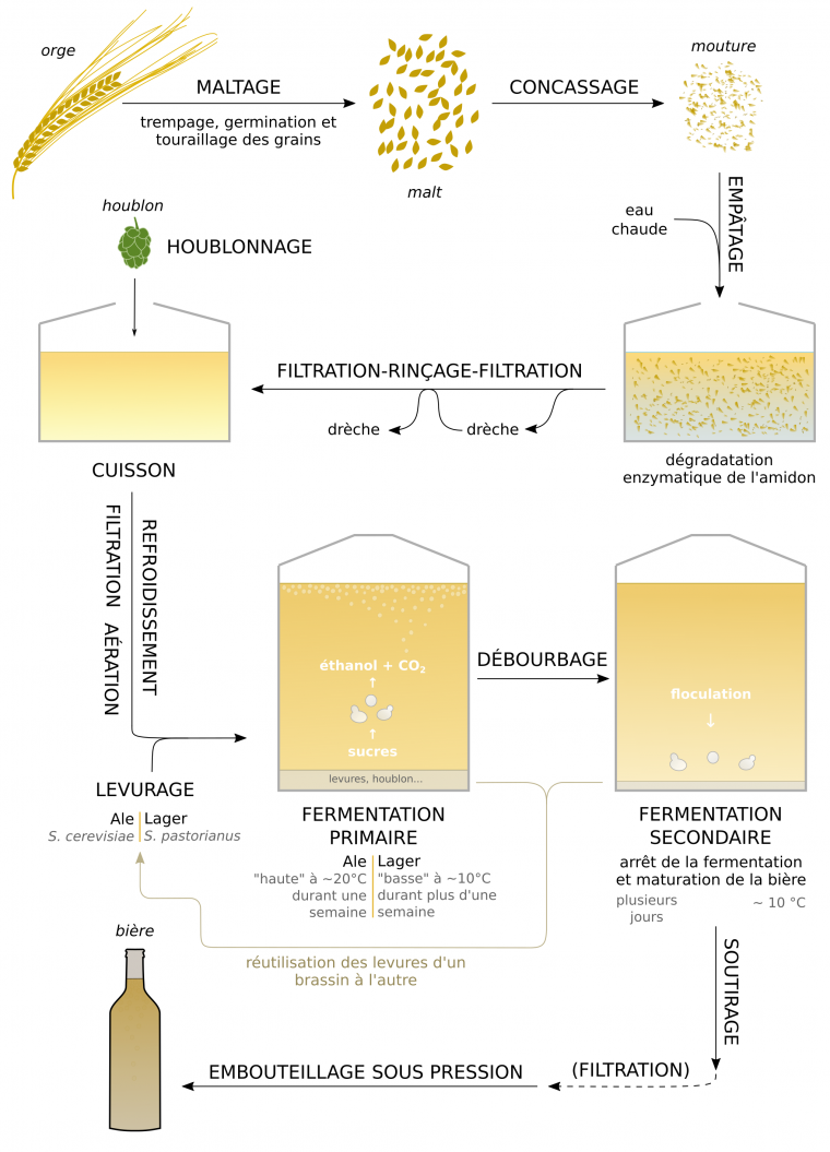 Le vin et la bière sont produits grâce à l’action du métabolisme fermentaire de levures domestiquées du genre Saccharomyces sur des produits végétaux, plus ou moins transformés : jus de raisin, éventuellement mélangé aux pellicules pour les vins, orge ou blé malté pour les bières. Alors que le jus de raisin contient déjà des sucres fermentescibles (glucose et fructose), l’orge et le blé contiennent essentiellement de l’amidon, non assimilable par les levures. C’est ce qui explique l’étape préalable de maltage réalisée dans la fabrication de la bière. Pour les deux types de boisson, la fermentation alcoolique du moût se produit à une température allant de 10 à 30 °C compatible avec la physiologie des levures employées. Alors que l’éthanol reste en solution, le dioxyde de carbone tend à s’échapper dans l’atmosphère mais peut cependant être partiellement conservé à l’état dissous dans la bière ou les vins pétillants, suite à une fermentation en cuve pressurisée ou par refermentation en bouteille. En plus de leur rôle dans la conversion des sucres en éthanol et CO2, les levures sont également impliquées dans la production de certains arômes via leur métabolisme carboné et azoté (arômes fermentaires) ou par hydrolyse de molécules présentes sous forme de précurseurs d’arômes dans le moût (arômes variétaux). Les levures contribuent également à dégrader certaines molécules aromatiques. Les souches de levures inoculées dans le moût sont d’ailleurs rigoureusement choisies par les brasseurs, tandis qu’en vinification traditionnelle l’inoculation se fait naturellement à partir de l’environnement de la cave, ce qui participe au terroir du produit1. Dans le cas du vin, le contact avec les pellicules de raisin et des fûts en bois est également à l’origine de transferts de composés aromatiques et colorés. Pour la bière, le goût varie en fonction du type de maltage pratiqué, des caractéristiques du houblonnage réalisé, et de l’éventuel ajout d’épices ou de fruits.