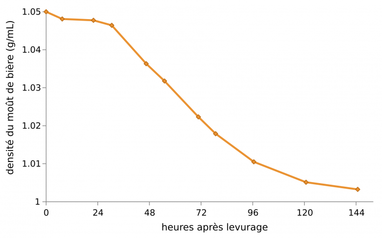À la suite du levurage, les levures se multiplient et entament une fermentation rapide des sucres, en une semaine environ pour les ales : c’est la fermentation « primaire » (ou tumultueuse). La cuve résistante à la pression permet la dissolution du CO2. La densité du moût est régulièrement mesurée jusqu’au ralentissement de la fermentation et l’atteinte de l’atténuation désirée (Figure 3).