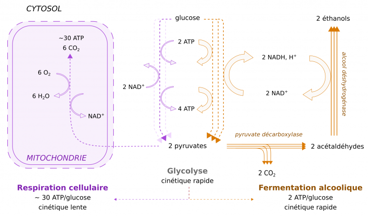 Le glucose présent dans le moût subit la glycolyse dans le cytosol des levures. Cette réaction aboutit à la production d’ATP, de coenzymes réduits NADH,H+, ainsi que de pyruvate. La fermentation alcoolique correspond à la décarboxylation du pyruvate, qui libère du CO2, et à la réduction de l’acétaldéhyde ainsi produit en éthanol, couplée à la réoxydation des coenzymes en NAD+. C’est par cette voie que les levures produisent préférentiellement leur ATP, même en conditions aérobies, lorsque le glucose est présent en quantité importante. Pourtant le rendement de la fermentation alcoolique, qui ne produit que deux molécules d’ATP par molécule de glucose est bien inférieur à celui de la respiration cellulaire (Figure 4) [5]. Ce désavantage apparent est contrebalancé par le fait que la vitesse de production d’ATP par fermentation est environ 100 fois plus rapide que par la voie respiratoire, en particulier du fait de la concentration importante des enzymes glycolytiques et fermentaires dans le cytosol. Ainsi, même si le rendement énergétique de la fermentation est environ 15 fois plus faible que celui de la respiration, cette voie métabolique permet de produire plus d’ATP [5].