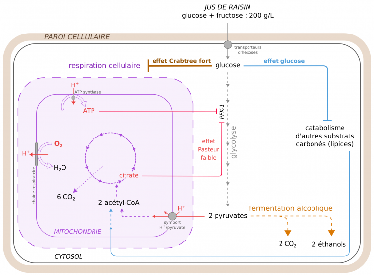 L’effet Pasteur (faible chez S. cerevisiae) est le mécanisme par lequel l’O2 favorise la respiration mitochondriale aux dépens de la fermentation [1, 5]. Cet effet s’explique par deux mécanismes. D’une part, certains intermédiaires et produits de la respiration freinent la glycolyse. En particulier, l’ATP et le citrate inhibent l’activité de l’enzyme glycolytique PFK-1 (phosphofructokinase 1), aboutissant à une réduction du flux glycolytique, et donc à une plus faible production de pyruvate. D’autre part, la force proton-motrice générée par le fonctionnement de la chaîne respiratoire permet l’import du pyruvate depuis le cytosol vers la mitochondrie, ce qui prive la pyruvate décarboxylase de son substrat et limite de fait la fermentation [5]. Ainsi, plus la respiration augmente, moins la glycolyse produit de pyruvate, et plus ce rare pyruvate est mobilisé pour la respiration mitochondriale. Un faible effet Pasteur permet à S. cerevisiae d’utiliser le dioxygène présent dans le moût pour son anabolisme (dont la synthèse de stérols membranaires) et se multiplier, notamment au début de l’étape de fermentation.