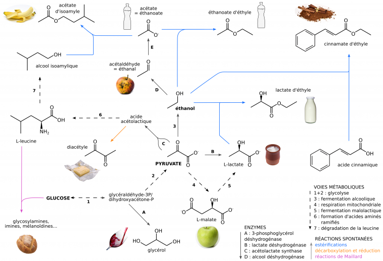 Le pyruvate occupe une place centrale dans les réseaux métaboliques, et certains de ses dérivés présentent des propriétés organoleptiques (Figure 8). La plupart de ces métabolites sont produits par les levures au cours de la fermentation puis durant son achèvement, qui correspond aux étapes d’élevage du vin (voir partie 2.2) ou de la « fermentation secondaire » de la bière (voir partie 3.4). Ils varient en quantité et en diversité en fonction des souches employées et des conditions de fermentation (température, oxygénation, nutriments disponibles…). Ces arômes sont les produits du métabolisme carboné et azoté des levures, mais peuvent également être issus de la simple hydrolyse de composés présents dans le milieu.