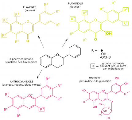 Ces molécules sont présentes sous formes d’hétérosides (molécule liée à un ou plusieurs sucres) dans le raisin, ce qui permet leur stabilisation et leur solubilisation [10, 27]. Les anthocyanes sont formées par un noyau anthocyanidol relié à un mono, di ou triholoside. L’exemple donné est celui de la pétunidine-3-O-glucoside présente dans le raisin noir.