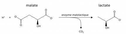 En parallèle de la fermentation alcoolique réalisée par les levures, la production de vins rouges et de certains blancs met en jeu la « fermentation » malolactique. Elle correspond simplement à la décarboxylation du malate du raisin en lactate. Il ne s’agit donc pas d’une fermentation stricto sensu et l’expression « conversion malolactique » devrait être préférée (Figure 6) [5].