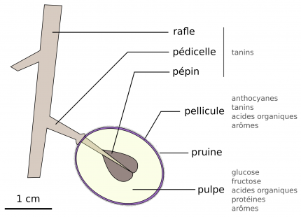 Ces molécules sont présentes en quantité différentes en fonction du cépage, du stade de maturité du fruit, et du terroir. Les principaux acides organiques sont les acides citrique, malique et tartrique, présents à des concentrations de quelques g/L. Les tanins sont des polyphénols aux propriétés antioxydantes, antimicrobiennes, pigmentaires et gustatives (goût herbacé, amertume et astringence) [9, 10].
