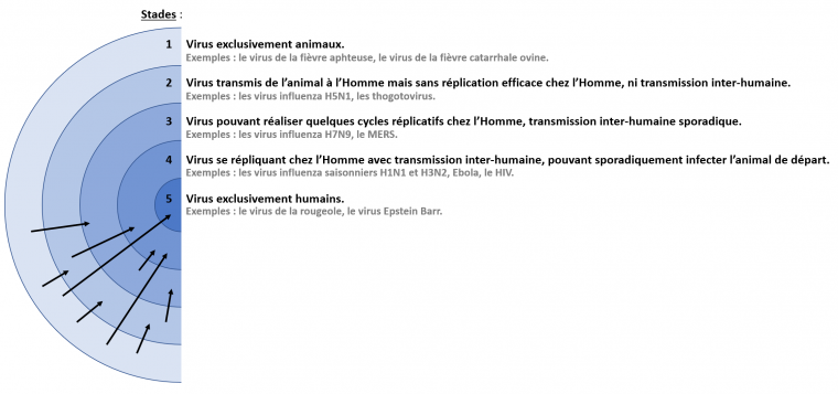 Les virus sont responsables de 25 % des maladies infectieuses émergentes humaines (Jones et al., 2008). Les exemples les plus connus sont l’épidémie de grippe espagnole de 1918 et du VIH (virus de l’immunodéficience humaine) depuis les années 80. L’émergence correspond à l’apparition d’un nouveau pathogène dans un hôte donné (Domingo, 2010), qui peut dans certains cas conduire à une épidémie, voire à une pandémie. Une ré-émergence correspond à la réapparition d’un pathogène après une période d’absence. Pike et al., (2010) ont défini 5 stades dans la transformation d’un virus animal en un virus humain, présentés en Figure 1. Le passage d’un stade à l’autre n’est pas inéluctable et requiert un certain nombre d’adaptations permises par la plasticité des génomes viraux (Domingo, 2010).