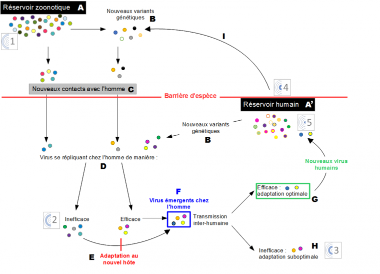 Lorsque des virus zoonotiques (A) entrent en contact avec l’Homme (C) ils rencontrent la barrière d’espèce qui est composée de facteurs cellulaires qui interfèrent avec le cycle viral : les facteurs de restriction. Les virus se répliquent dans le nouvel hôte de manière plus ou moins efficace (D). Des mutations chez les virus se répliquant inefficacement peuvent conduire à une adaptation de ces virus au nouvel hôte (E). Ces virus sont alors dits émergents (F) chez l’Homme. Parmi ces virus certains se transmettront efficacement dans la population humaine (G) et entreront dans le réservoir humain (A'), alors que d’autres, dont l’adaptation est sub-optimale, ne se transmettront pas entre Hommes. Que ce soit dans le réservoir zoonotique ou humain la réplication virale conduit à l’apparition de mutations et donc de nouveaux variants génétiques (B) qui seront sélectionnés par leur capacité à se répliquer dans l’hôte. La diversité génétique des virus est représentée par les différentes couleurs. Les pictogrammes numérotés de 1 à 5 font référence aux différents stades de l’émergence d’un virus humain décrits dans la figure 1.