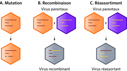 Les quasi-espèces virales forment un réservoir dynamique de variants génétiques (Figure 2B) jouant un rôle à toutes les étapes de l’émergence. Cette variabilité génétique découle de l’action cumulée des mutations, recombinaisons ou réassortiments des génomes viraux (Figure 3).