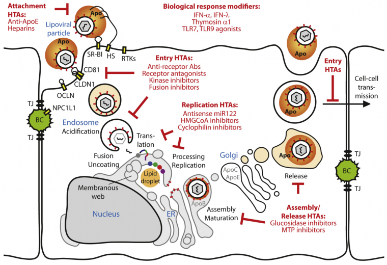 Le cycle viral du VHC présente des étapes clefs : son entrée dans l’hépatocyte, la traduction de ses protéines puis la mise en place de son complexe de réplication (grâce aux clivages activateurs réalisés par sa protéase NS3/4A), la réplication de son ADN (polymérase NS5B), l’assemblage de sa capside avec les gouttelettes lipidiques (lipid droplet), puis avec son ARN (en noir) et son enveloppe glycoprotéique (via l’action de NS5A). Les traitements utilisés pour lutter contre le VHC (en rouge) ciblent ces différentes étapes.