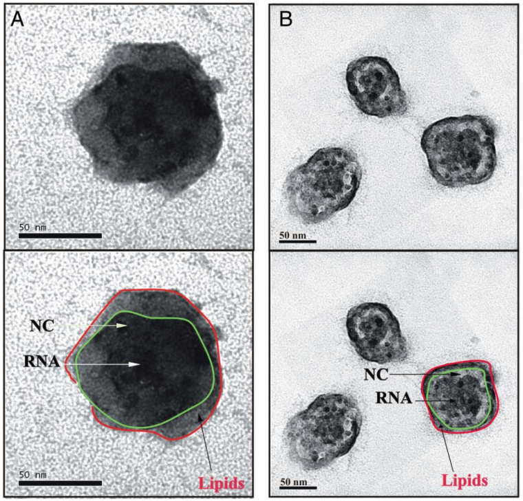 L’ARN du virus (RNA) est entouré par la nucléocapside (NC), elle-même incluse dans une couche lipidique (lipids). La colonne B met en évidence la taille variable des virions.