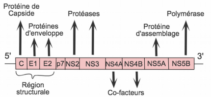 L’ARN viral est tout d’abord traduit en une polyprotéine qui sera maturée par les protéines virales et cellulaires. Dix protéines matures sont produites. Il s’agit de protéines structurales : la protéine Core (impliquée dans la formation de la capside), les glycoprotéines d’enveloppe E1 et E2 ; ainsi que de protéines non structurales : p7, NS2, NS3, NS4A, NS4B, NS5A et NS5B [11]. L’ARN viral sert également de matrice pour être amplifié par l’ARN polymérase NS5B.